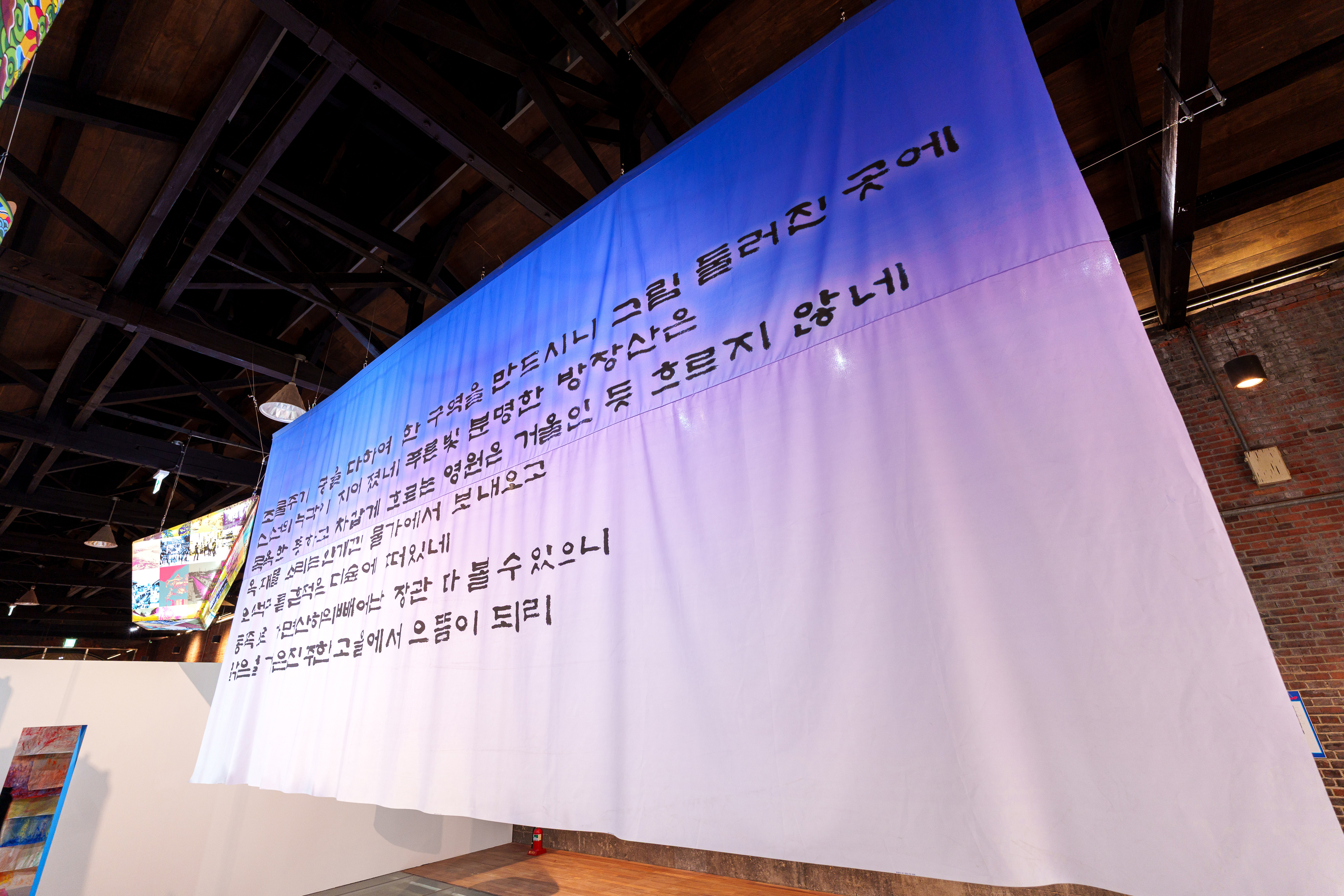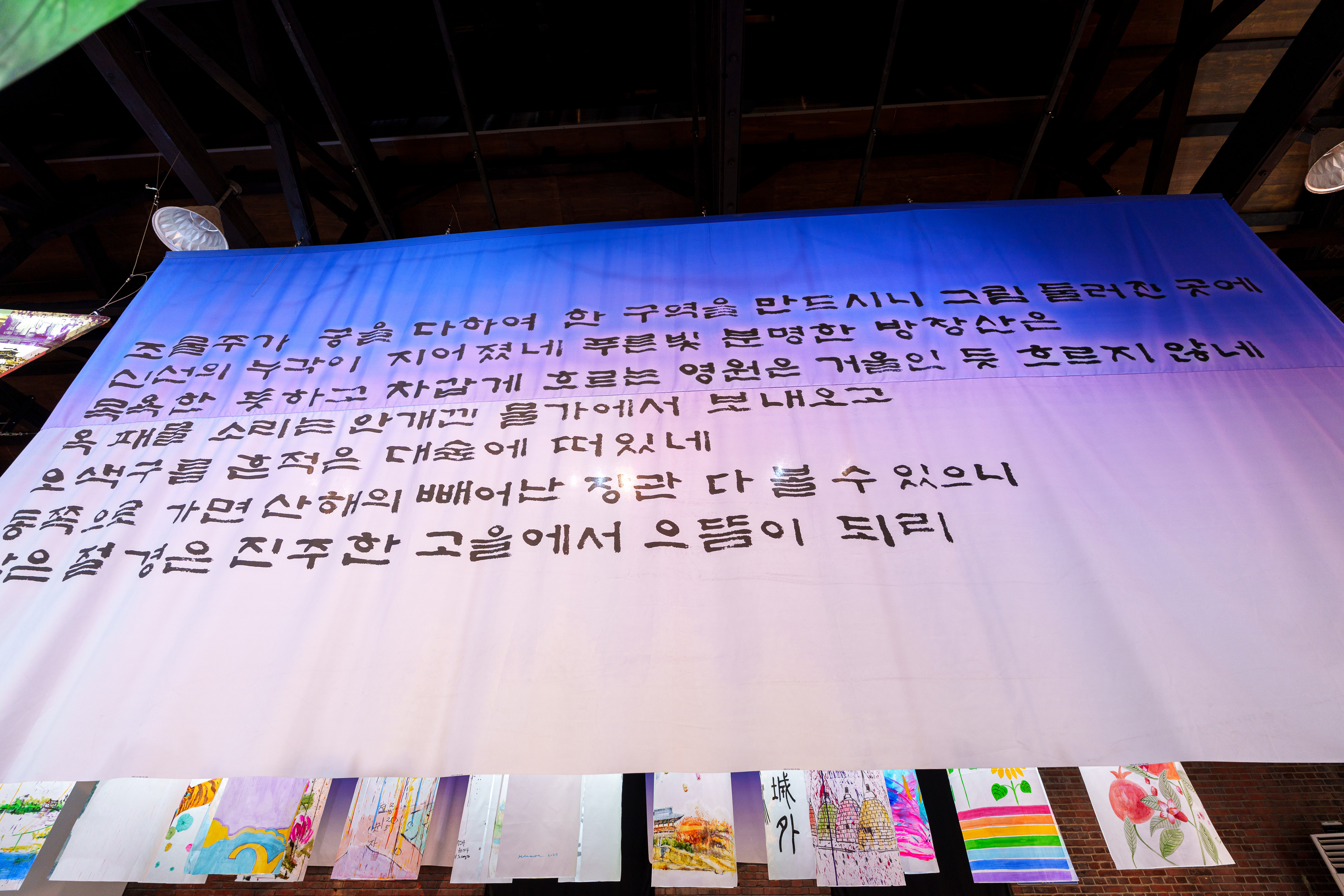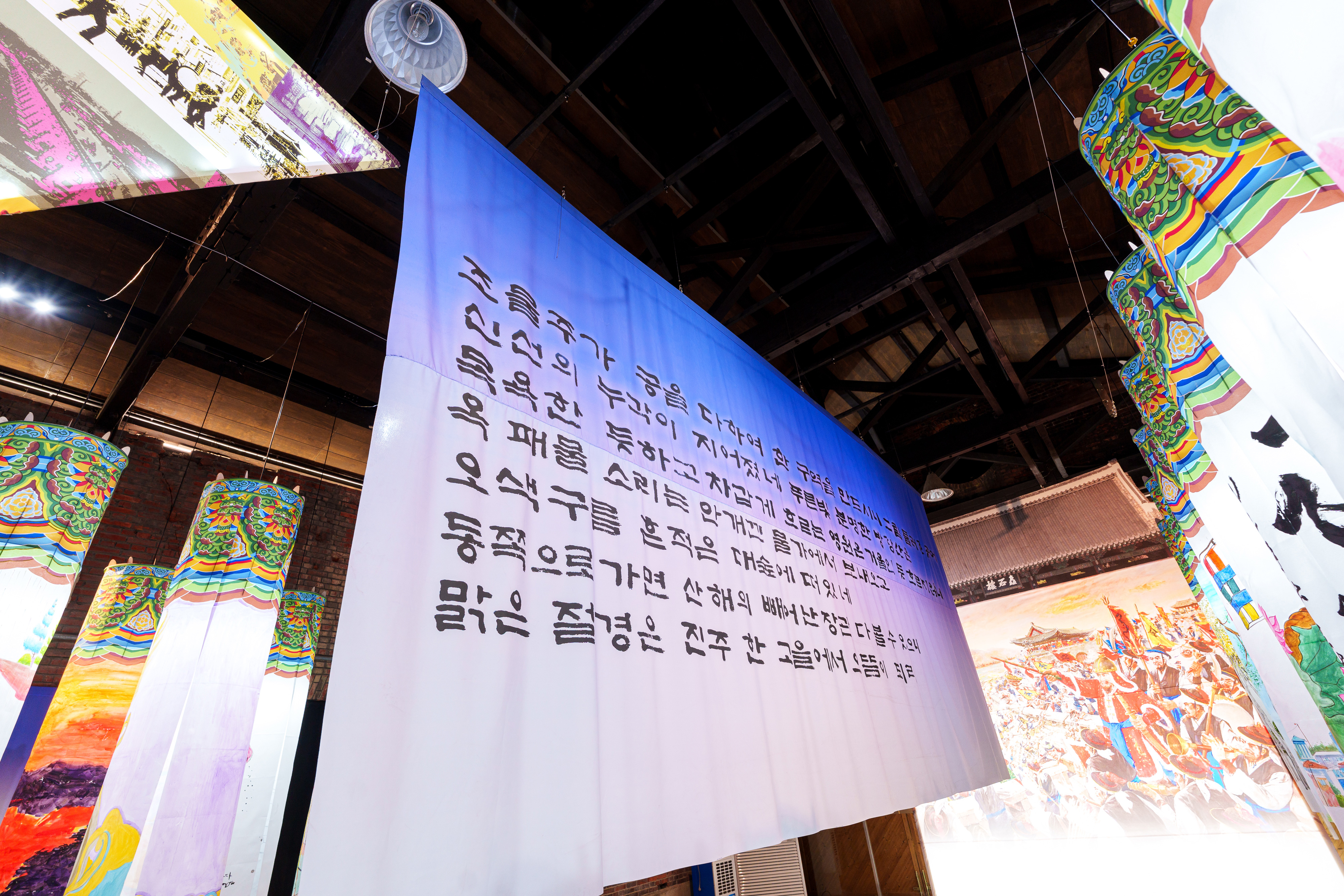 빛을 머금은 천 사이로 스며드는 한획 한획의 서예는 남강이 지닌 공간적 의미뿐 아니라, 진주 사람들의 삶과 감정의 결까지 함께 품고 있습니다.